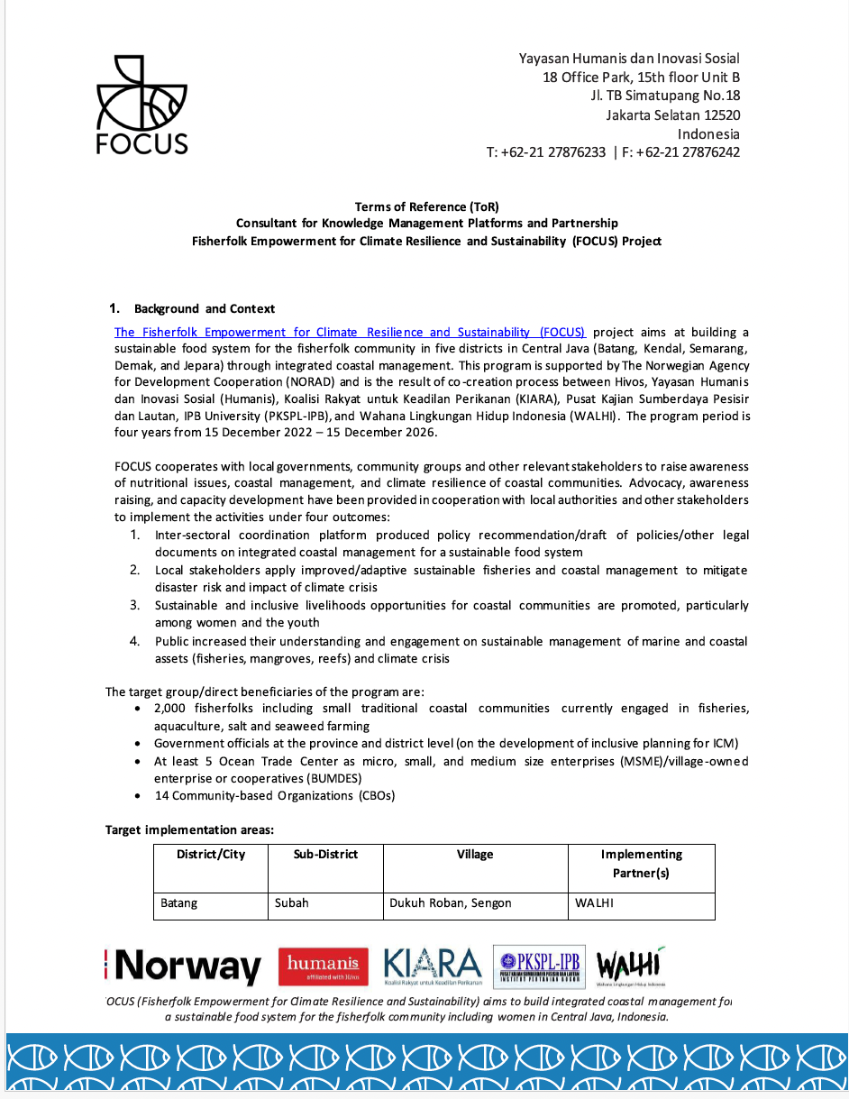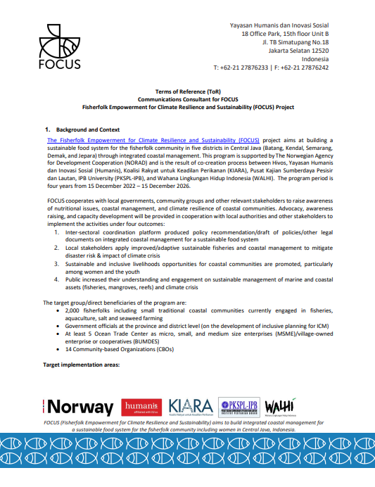 Feb 24, 2026 Views 62Key Responsibilities The Consultant will assist in the development, management, and dissemination of the project’s communication materials to support the achievement of the project goals and expected results. The consultant will report directly to the FOCUS Project Manager at Yayasan Humanis and work in close collaboration with communication personnel of FOCUS Consortium members and Yayasan Humanis Communications Manager (if required).