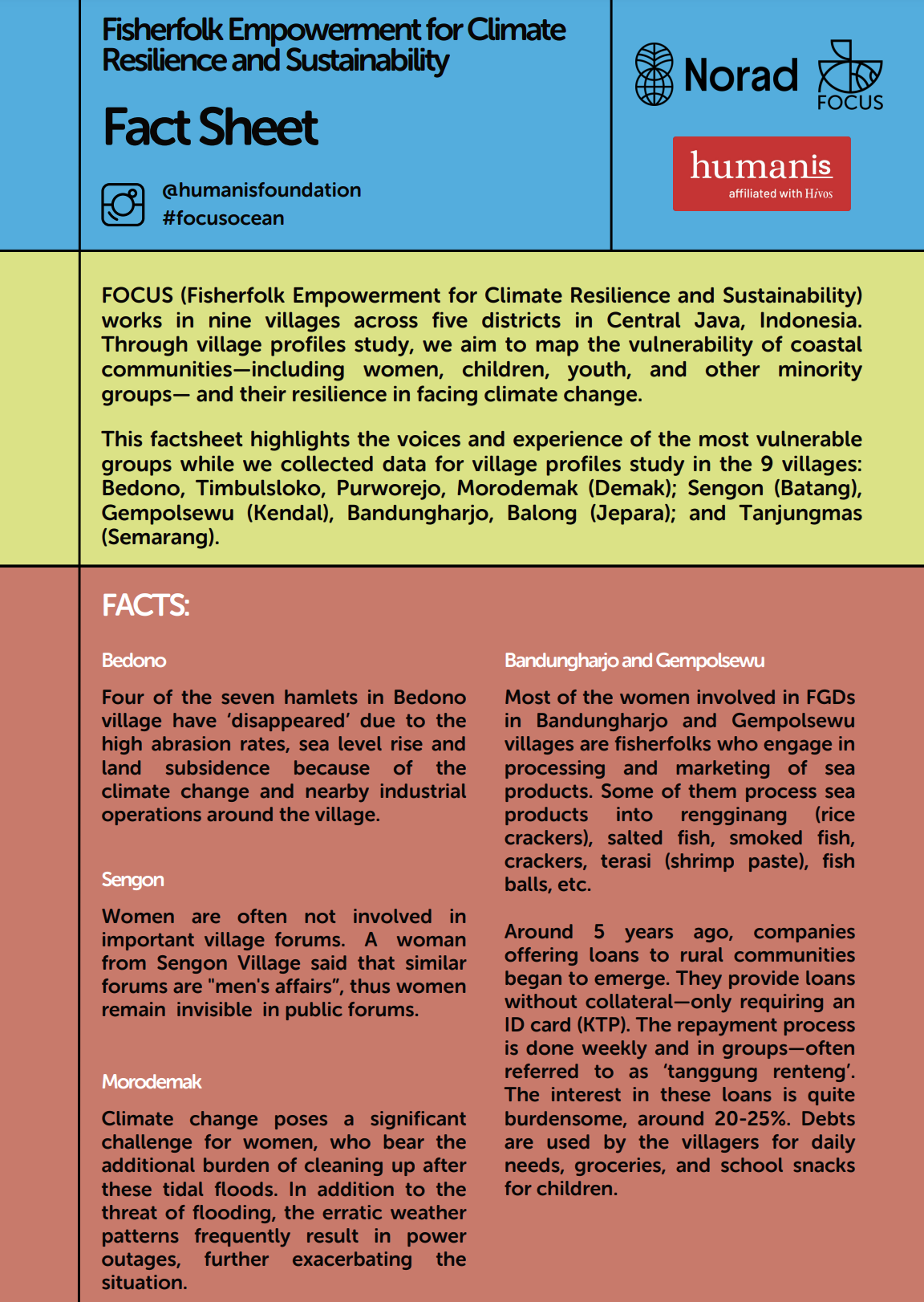 Mar 06, 2026 Views 12This factsheet highlights the voices and experience of the most vulnerable groups while we collected data for village profiles study in the 9 villages: Bedono, Timbulsloko, Purworejo, Morodemak (Demak); Sengon (Batang), Gempolsewu (Kendal), Bandungharjo, Balong (Jepara); and Tanjungmas (Semarang